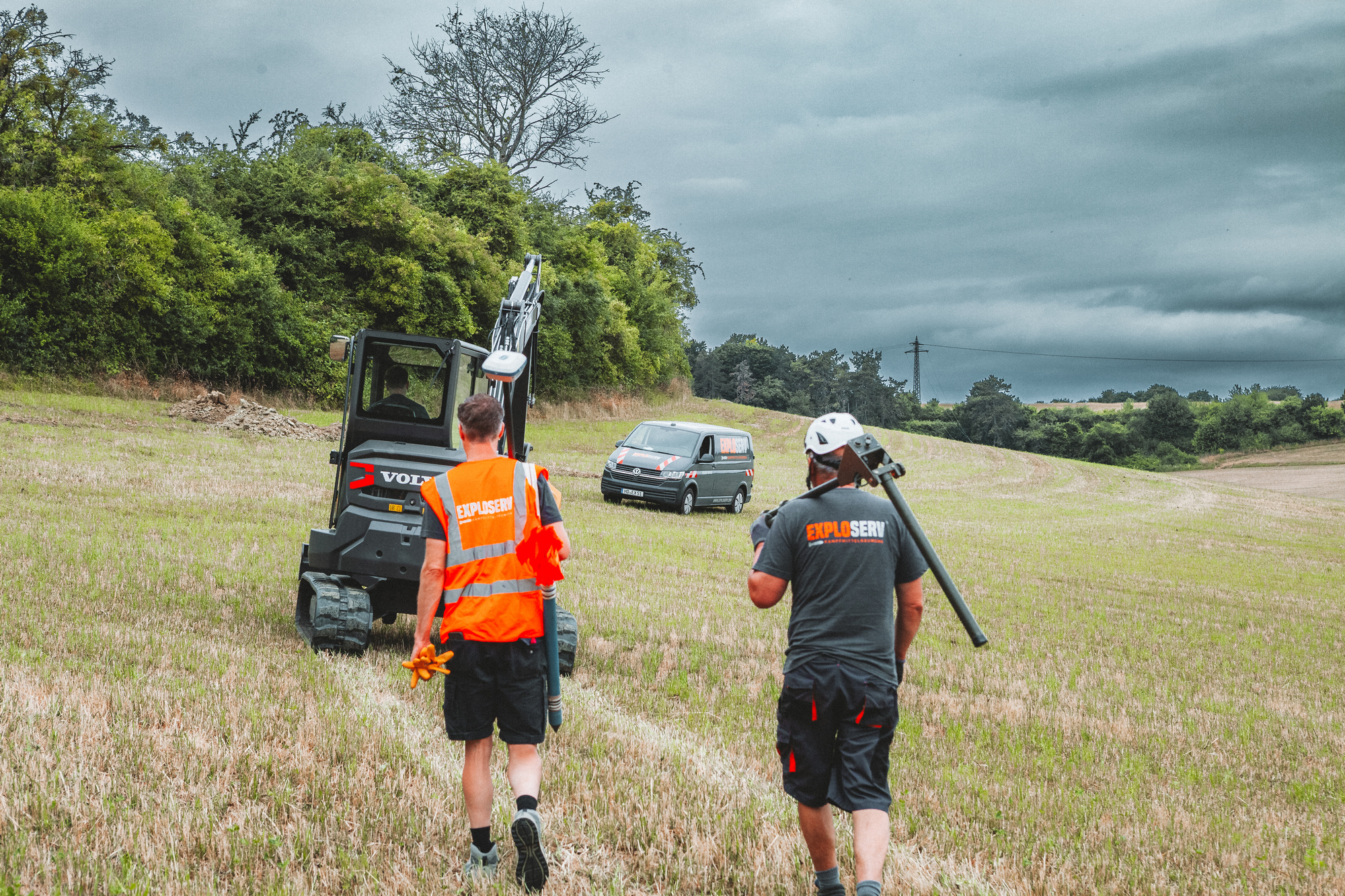 Zunächst werden die Flächen mit geomagnetischen Verfahren untersucht. Auffälligkeiten in der Auswertung, sogenannte kampfmittelrelevante Verdachtskörper, werden kartiert und anschließend zielgerichtet freigelegt. Dazu wird das Erdreich abschnittsweise mit dem Bagger abgetragen, während unser fachtechnisches Personal parallel mit der Handsonde nach der Ursache der Störung sucht.